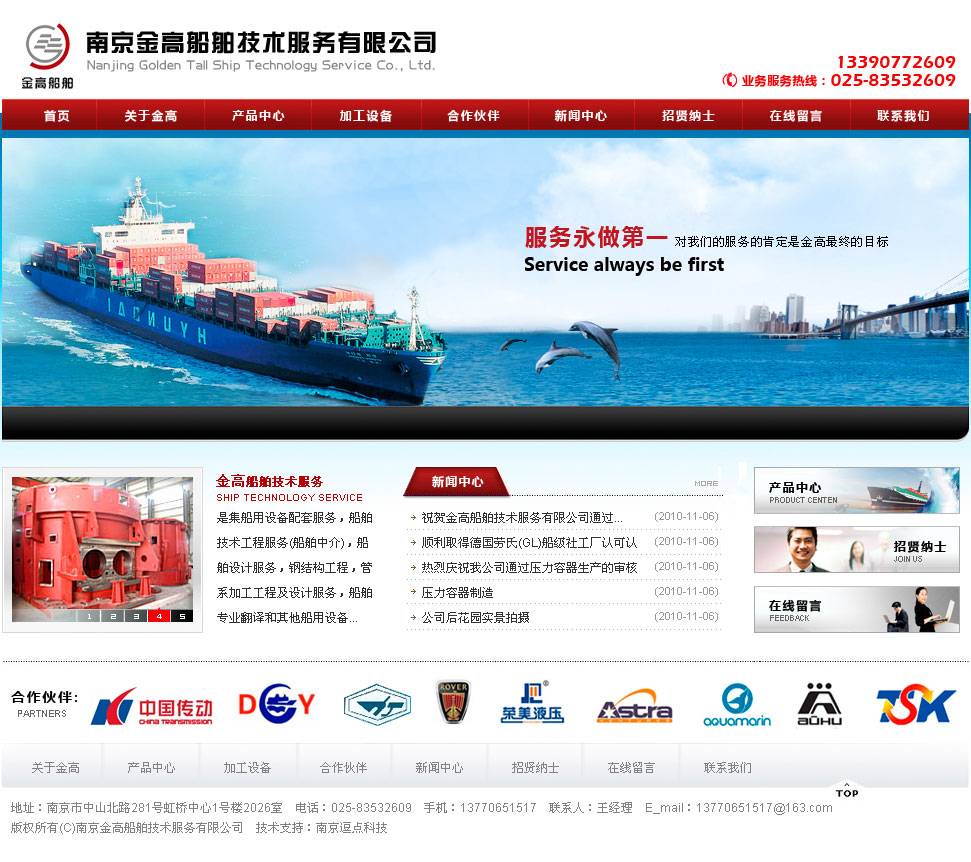 南京金高船舶技術(shù)服務(wù)有限公司是集船用設(shè)備配套服務(wù),船舶技術(shù)工程服務(wù)(船舶中介),船舶設(shè)計服務(wù),鋼結(jié)構(gòu)工程,管系加工工程及設(shè)計服務(wù),船舶專業(yè)翻譯和其他船用設(shè)備的服務(wù)公司。本公司與國內(nèi)多家大型船廠和大型鋼結(jié)構(gòu)企業(yè)有著良好的合作關(guān)系,其中包括南京武家嘴船廠,江蘇鼎衡船業(yè),江蘇科進(jìn)船業(yè),南京高精船用設(shè)備公司,鎮(zhèn)江同舟螺旋槳公司,滁州(南京)大益船舶,南通沿江管業(yè)公司。本公司還與國內(nèi)多家船舶設(shè)計院有著良好的關(guān)系,設(shè)計院包括上海船舶研究設(shè)計院、上海佳豪船舶設(shè)計院、中國船舶工業(yè)第七零八研究所、上海恒波設(shè)計公司、南京歐海船舶科技公司等。本公司管理層致力于中國船舶業(yè)的發(fā)展,把船舶配套服務(wù)作為公司發(fā)展的主線。使本公司代理的南高齒的船用推進(jìn)系統(tǒng)能廣泛的運(yùn)用到全世界的船舶上。本公司的宗旨是:優(yōu)質(zhì)服務(wù),誠信做人,互惠互利,共同發(fā)展。目的是促進(jìn)國產(chǎn)船用設(shè)備的發(fā)展和提高國產(chǎn)船用設(shè)備的市場占有率。
